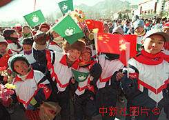 西藏拉薩市的藏族兒童在澳門回歸祖國之際,連日來冒著嚴寒在街上與成人一起游行。