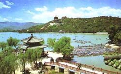 北京明、清時所修宮廷苑囿,不少是依照江南的風景名勝。昆明湖西部的設計,很顯然是完全依照西湖蘇堤、白堤的風景情調,如果劃條小船,劃到龍王廟西北一點水面上,向西望去,則很象在杭州西湖中,望清波門外昭慶寺門前到斷橋的那一段堤痕,玉泉山正像初陽臺,玉泉山的塔如同保俶塔,情趣十分近似。