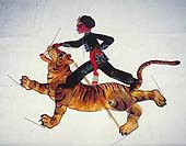由于這種藝術歷史悠久,源遠流長,所以其流傳范圍極廣,名稱也不同;因其演員只有一人,故南方各省稱之為“單人班”;因表演時人藏在布帷之中,故四川省稱之為“被單戲”;又因以扁擔挑道具并支撐臨時搭起的小戲臺,故在河北吳橋等地稱為“扁擔戲”。有關傀儡戲的表演方式及特點,可見《揚州畫舫錄》中一段記載:“圍布作房,支以一木,以五指運三寸傀儡,金鼓喧鬧,詞、白皆用叫嗓子,均一人為之,謂之扁擔戲!
